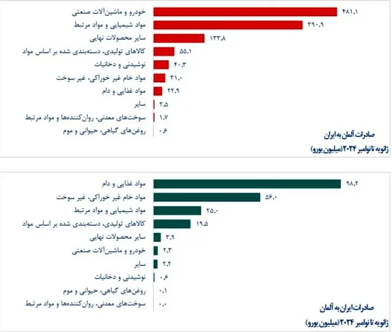 در این بازه، صادرات آلمان به ایران ۱.۱۶ میلیارد یورو بوده که در مقایسه با صادرات ۱.۰۹ میلیارد یورویی در ۲۰۲۳، ۶ درصد بیشتر شده است. صادرات ایران به آلمان هم به ۲۰۸ میلیون یورو رسید که به نسبت صادرات ۲۲۲ میلیون یورویی در مدت مشابه سال قبل، ۶ درصد کاهش داشته است.
