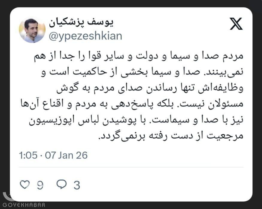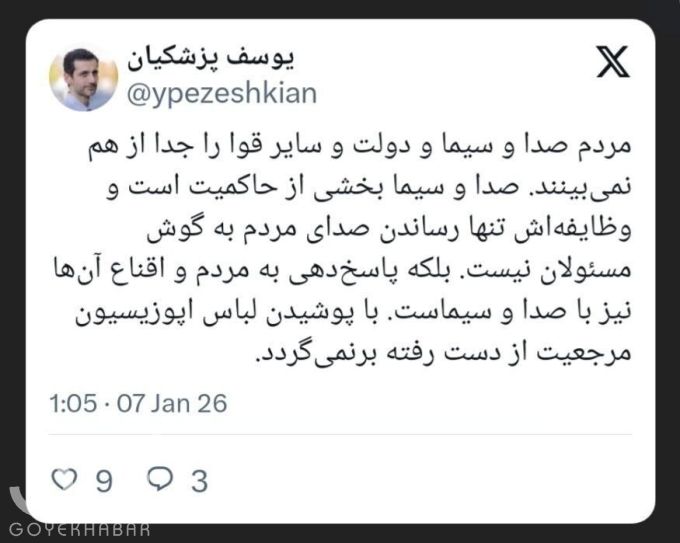 یوسف پزشکیان، فرزند رئیس جمهور در شبکه اجتماعی ایکس (توییتر سابق) نوشت: مردم صدا و سیما و دولت و سایر قوا را جدا از هم نمیبینند. صدا و سیما بخشی از حاکمیت است و وظایفهاش تنها رساندن صدای مردم به گوش مسئولان نیست. بلکه پاسخدهی به مردم و اقناع آنها نیز با صدا و سیماست. با پوشیدن لباس اپوزیسیون مرجعیت از دست رفته برنمیگردد.