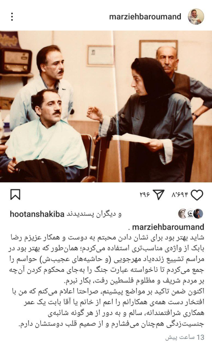 گوی خبر- این کارگردان با انتشار عکسی از پشت صحنه سریال آرایشگاه زیبا که در آن حمید جبلی، رضا بابک و زنده یاد مرتضی احمدی هم دیده میشوند در صفحه مجازی خود نوشته است: «شاید بهتر بود برای نشان دادن محبتم به دوست و همکار عزیزم رضا بابک از واژه مناسبتری استفاده میکردم؛ همانطور که بهتر بود در مراسم تشییع زنده یاد مهرجویی (و حاشیههای عجیبش) حواسم را جمع میکردم تا ناخواسته عبارت جنگ را به جای محکوم کردن آنچه بر مردم شریف و مظلوم فلسطین رفت به کار نبرم.